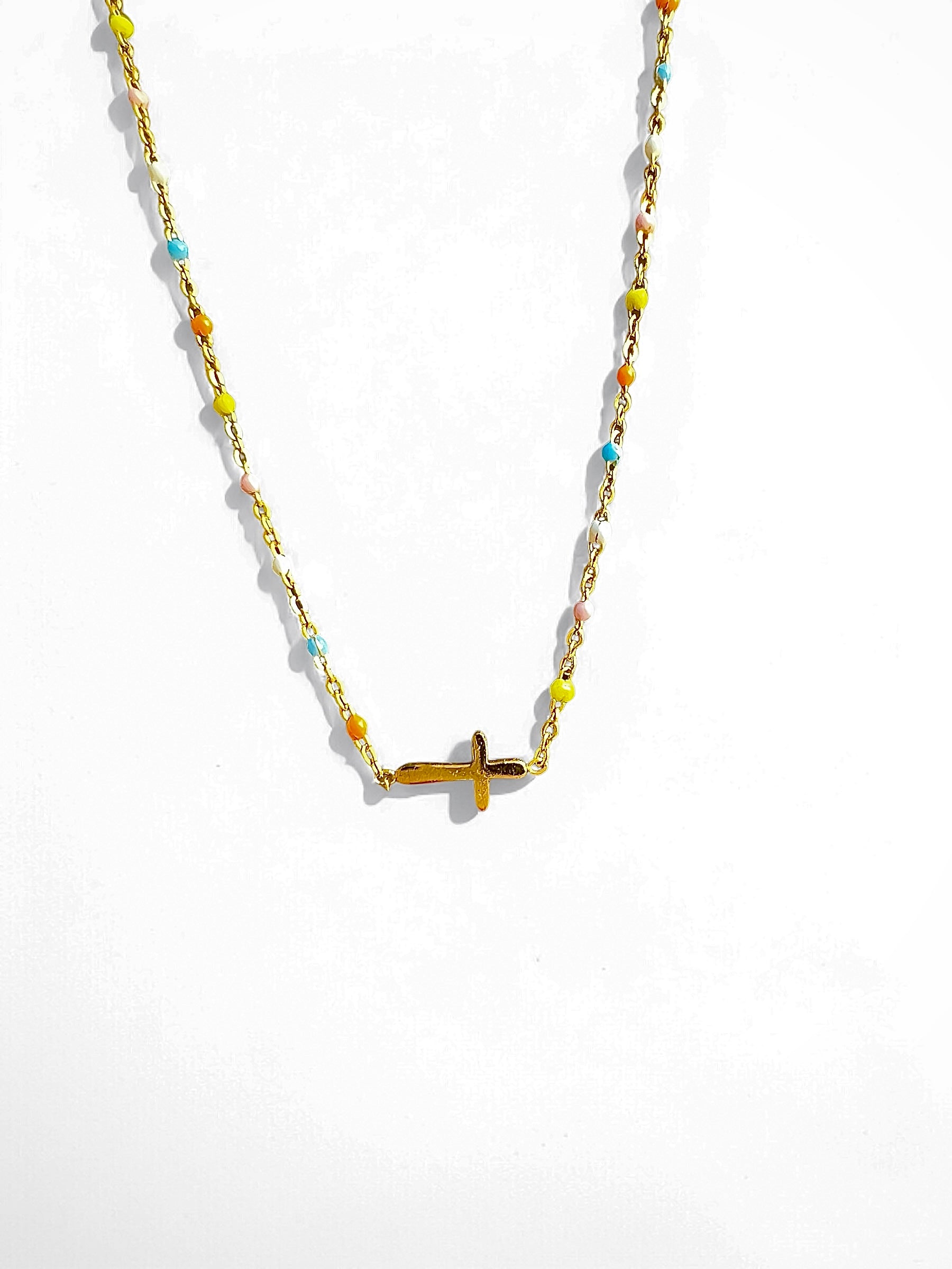 Add a vibrant touch of spirituality to your look with our Colorful Beaded Cross Necklace. Featuring a delicate cross charm surrounded by multicolor beads, this piece blends faith and fashion in a playful, meaningful way.
