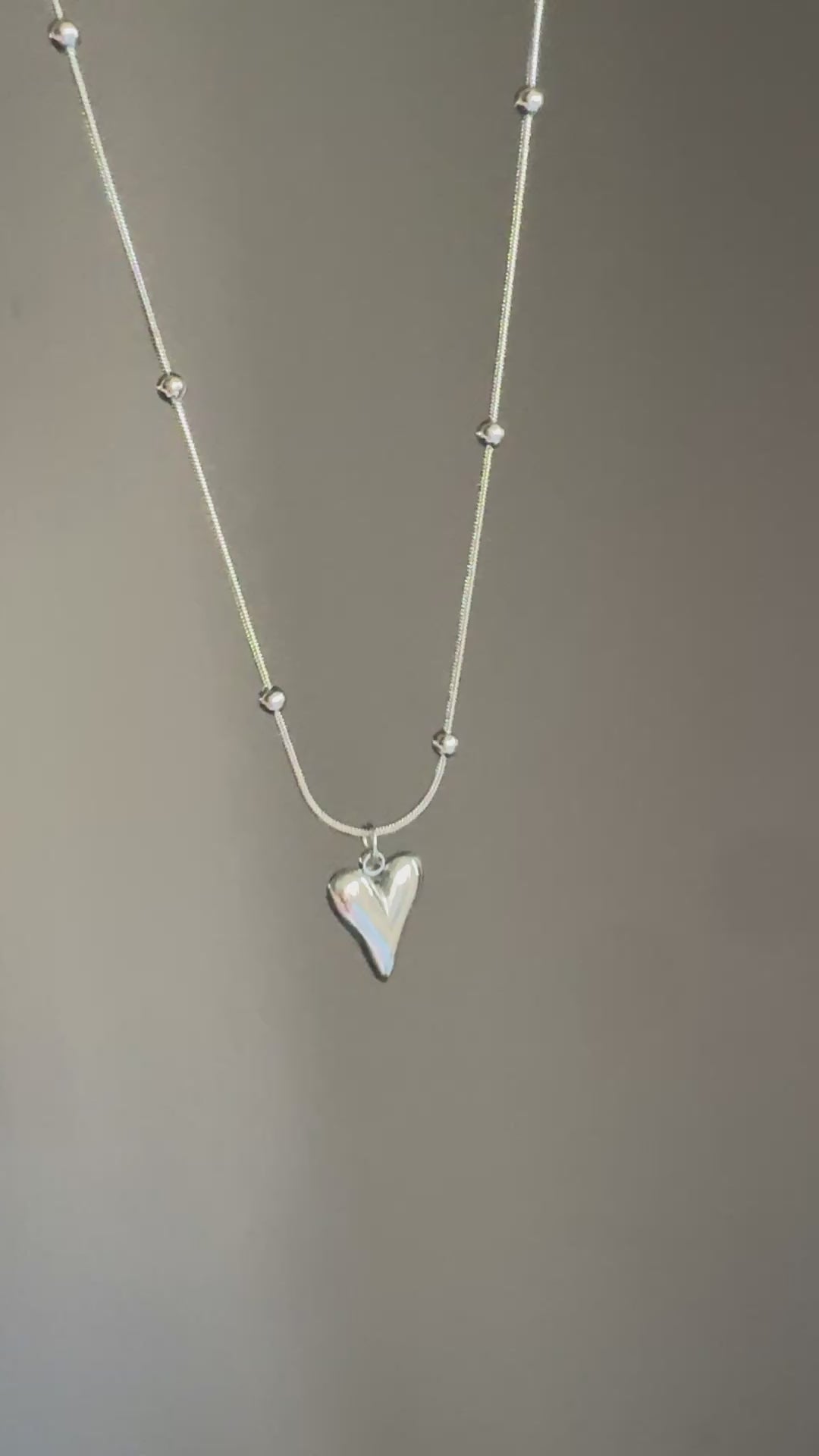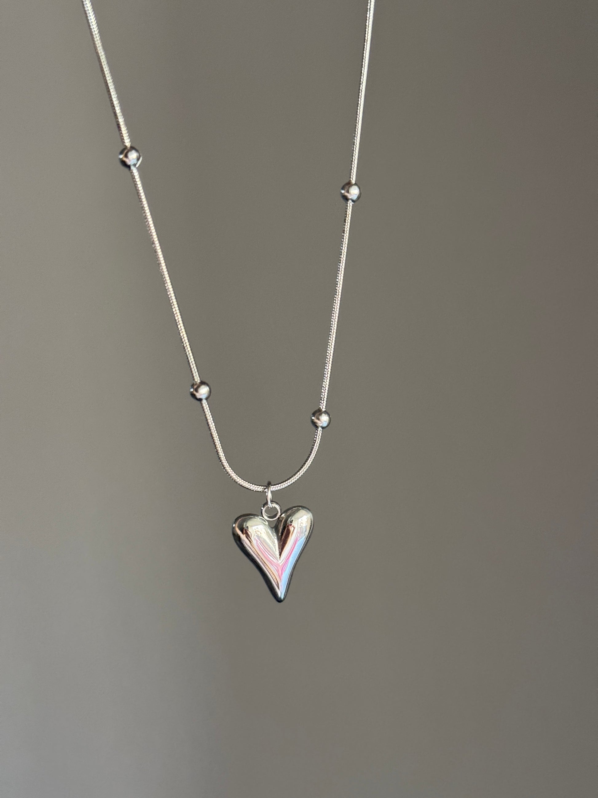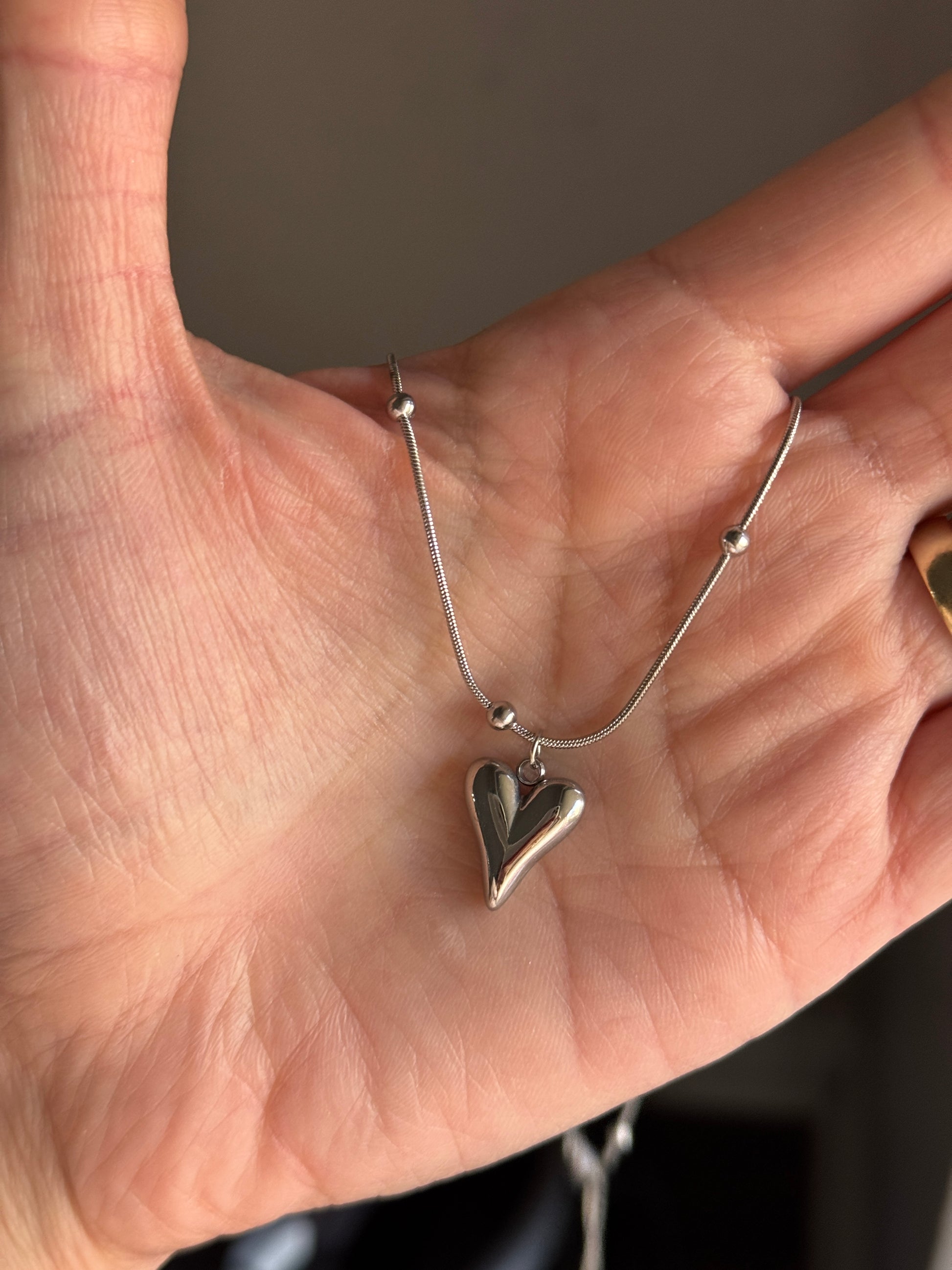 Delicate silver chain with a heart-shaped pendant, made of stainless steel, resistant to tarnishing, waterproof, and nickel-free—perfect for adding a romantic and elegant touch to any outfit.